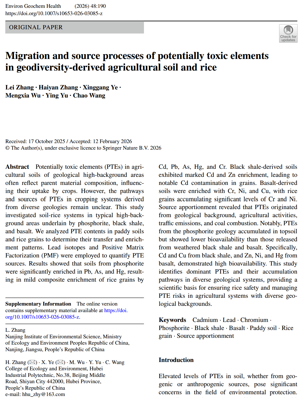 两篇论文分别发表于JCR分区Q1期刊《Environmental Geochemistry and Health》(Zhang, L., Zhang, H., Ye, X. et al. Migration and source processes of potentially toxic elements in geodiversity-derived agricultural soil and rice. Environ Geochem Health 48, 190 (2026). 章海燕博士为第一通讯作者)和JCR分区Q2期刊《PeerJ》(Zhang, H., Liao, C., Wang, C. et al. Phosphatic rock weathering and agricultural activities driving the dynamics of potentially toxic elements in surface soil of weathered zone. PeerJ 14, e21110(2026). 章海燕博士和廖长广博士为共同第一作者),研究内容聚焦地质高背景区土壤-水稻系统中潜在有毒元素(PTEs)的迁移转化机制。两篇论文我校均为第一完成单位。